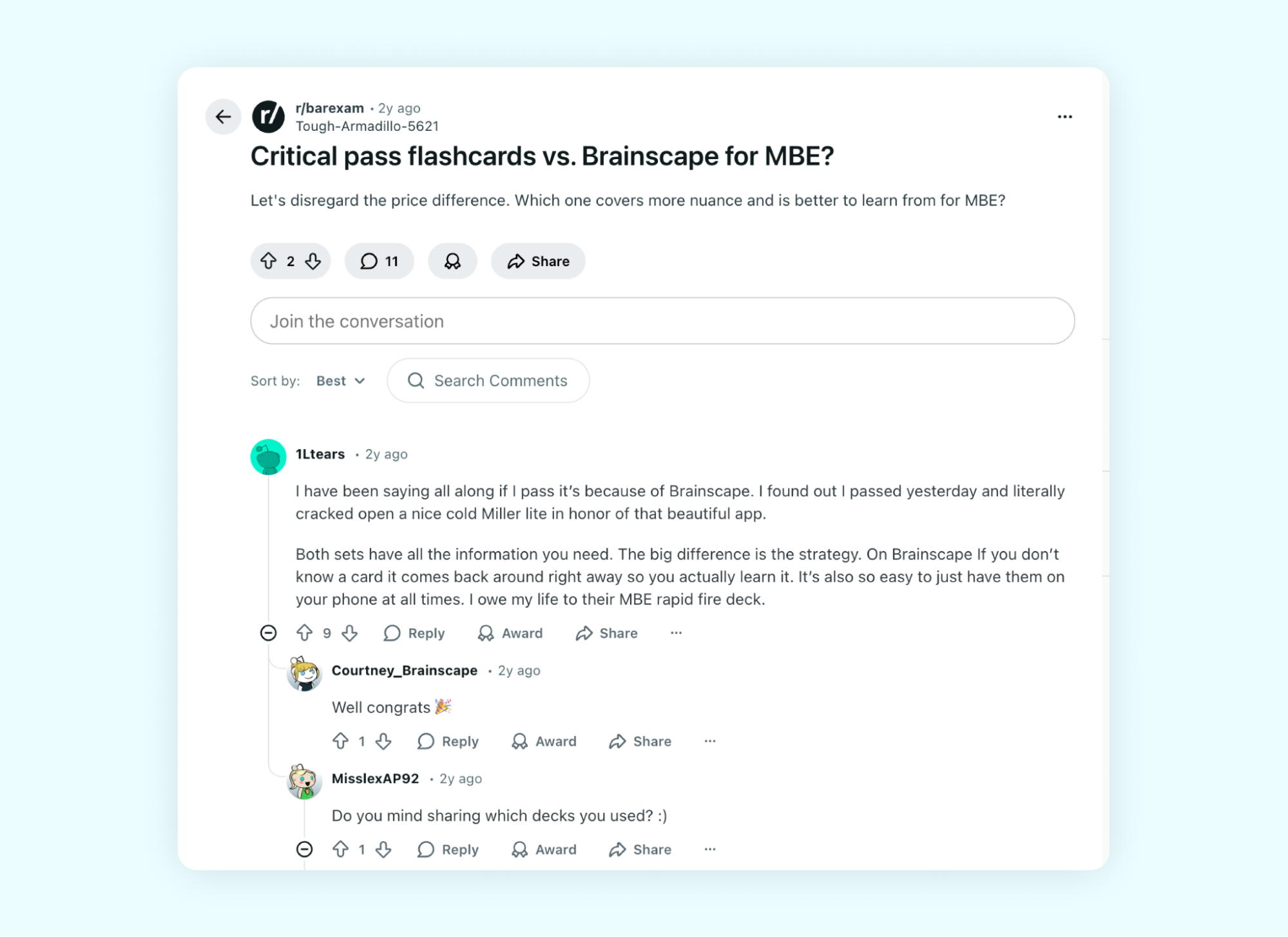 By the time most students hear about Brainscape, they already have Barbri or Themis lectures, outlines, flashcards, and a question bank.